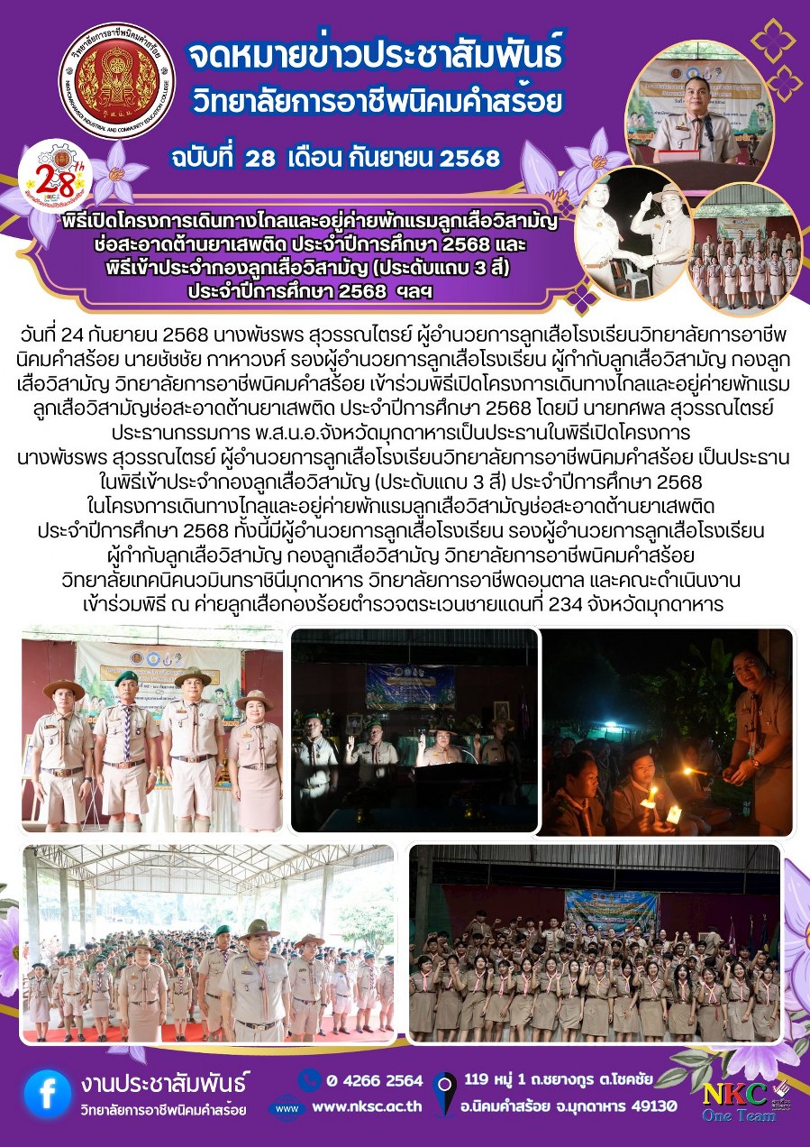 ฉบับที่ 28 ก.ย. 2568 พิธีเปิดโครงการเดินทางไกลและอยู่ค่ายพักแรมลูกเสือวิสามัญช่อสะอาดต้านยาเสพติด