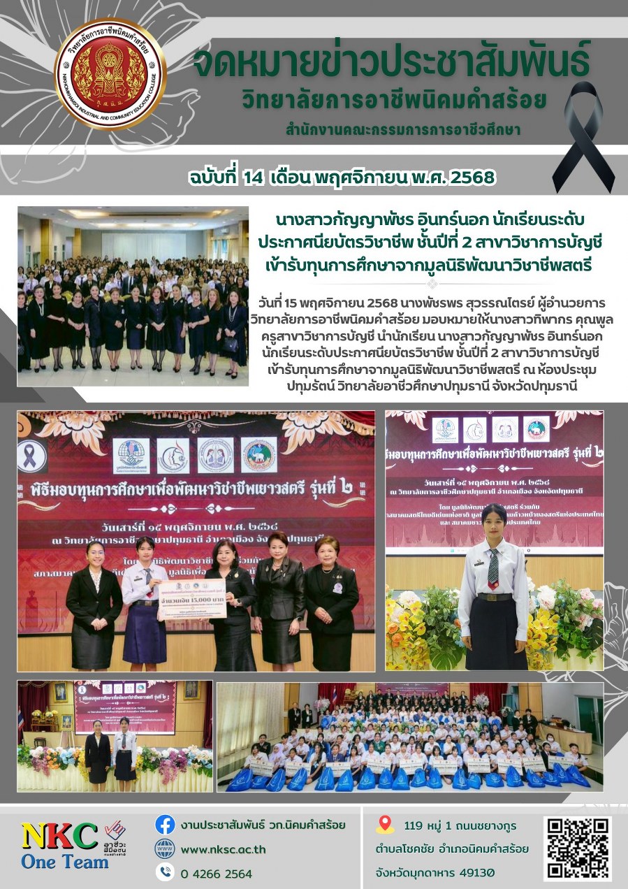 ฉบับที่ 14 พ.ย. 2568 นักเรียน ปวช.2 สาขาวิชาการบัญชี เข้ารับทุนการศึกษาจากมูลนิธิพัฒนาวิชาชีพสตรี