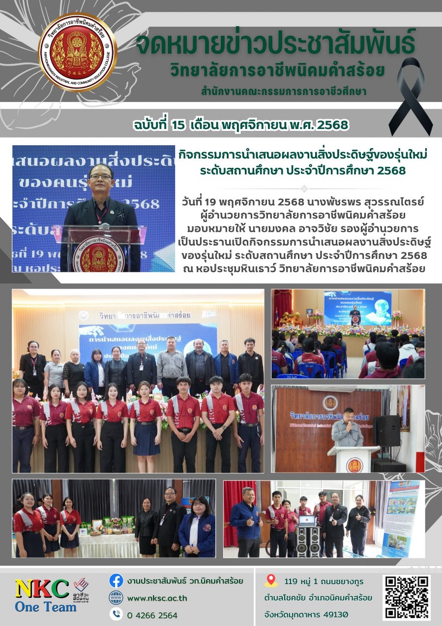ฉบับที่ 15 พ.ย. 2568 กิจกรรมการนำเสนอผลงานสิ่งประดิษฐ์ของรุ่นใหม่ ระดับสถานศึกษา