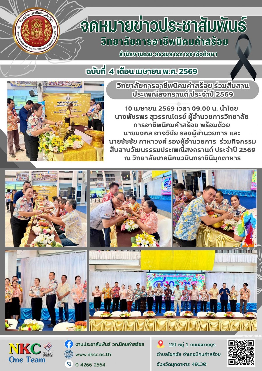 ฉบับที่ 4 เม.ย. 2569 กิจกรรมสืบสานวัฒนธรรมประเพณีสงกรานต์ ณ วิทยาลัยเทคนิคนวมินทราชินีมุกดาหาร