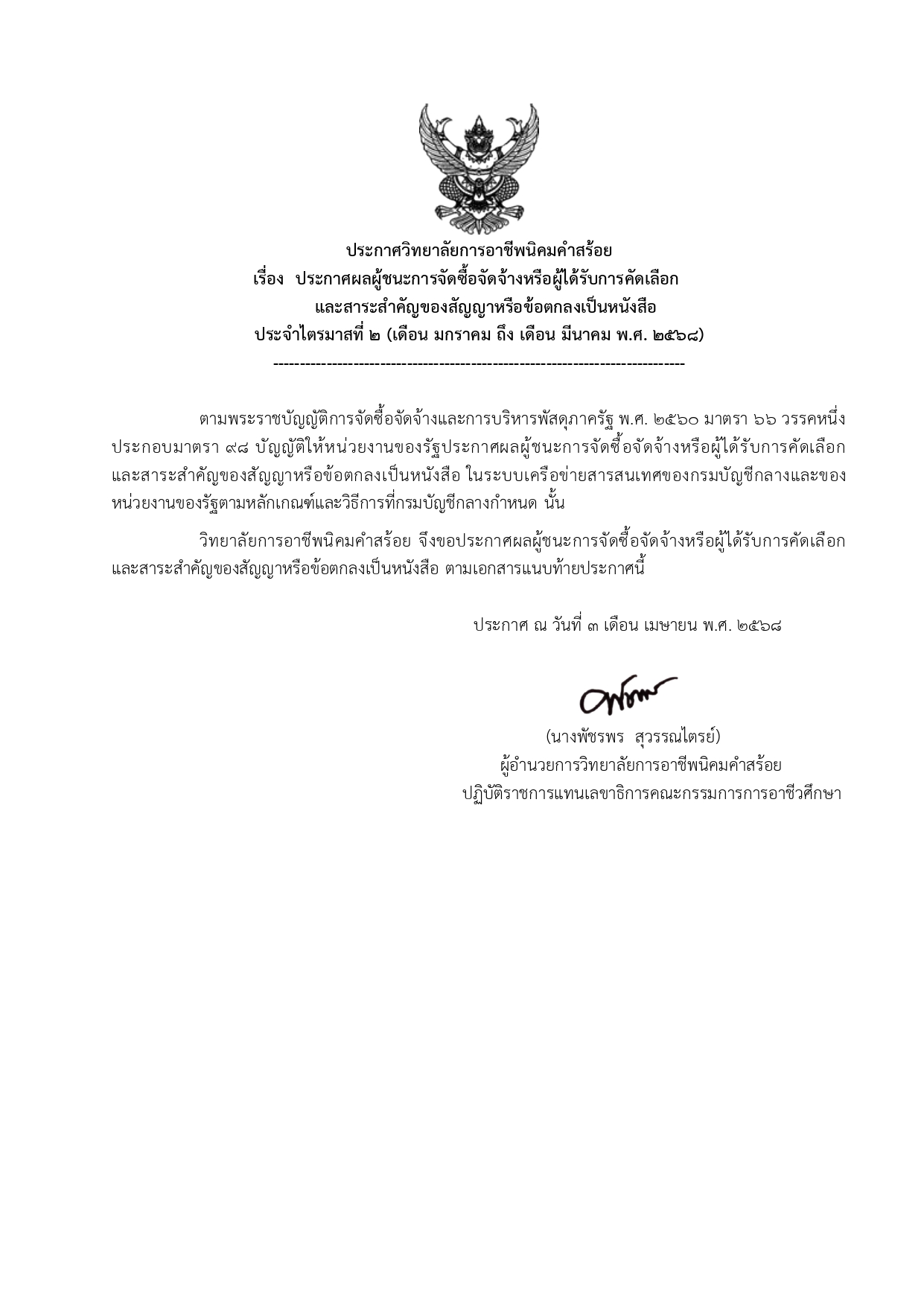 ประกาศผลผู้ชนะการจัดซื้อจัดจ้างหรือผู้ได้รับการคัดเลือก ประจำไตรมาสที่ 2