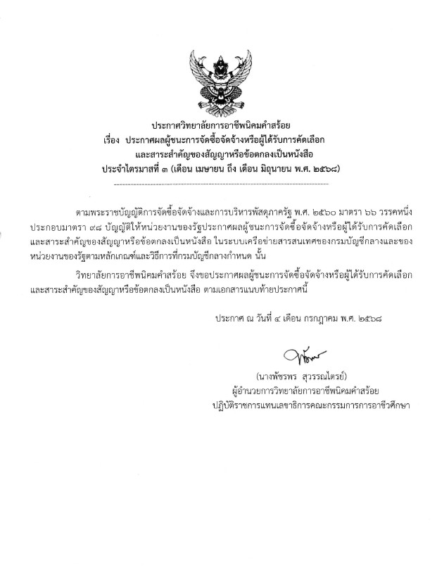 ประกาศผลผู้ชนะการจัดซื้อจัดจ้างหรือผู้ได้รับการคัดเลือก ประจำไตรมาสที่ 3 (เม.ย. - มิ.ย. 68)