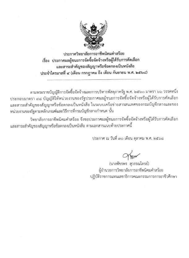 ประกาศผลผู้ชนะการจัดซื้อจัดจ้างหรือผู้ได้รับการคัดเลือก ประจำไตรมาสที่ 4 (ก.ค. - ก.ย. 68)