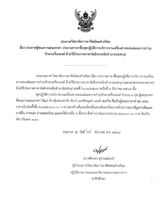 ประกาศผู้ชนะการเสนอราคา ประกวดราคาซื้อชุดปฏิบัติการบริการงานเครื่องล่างรถยนต์ฯ