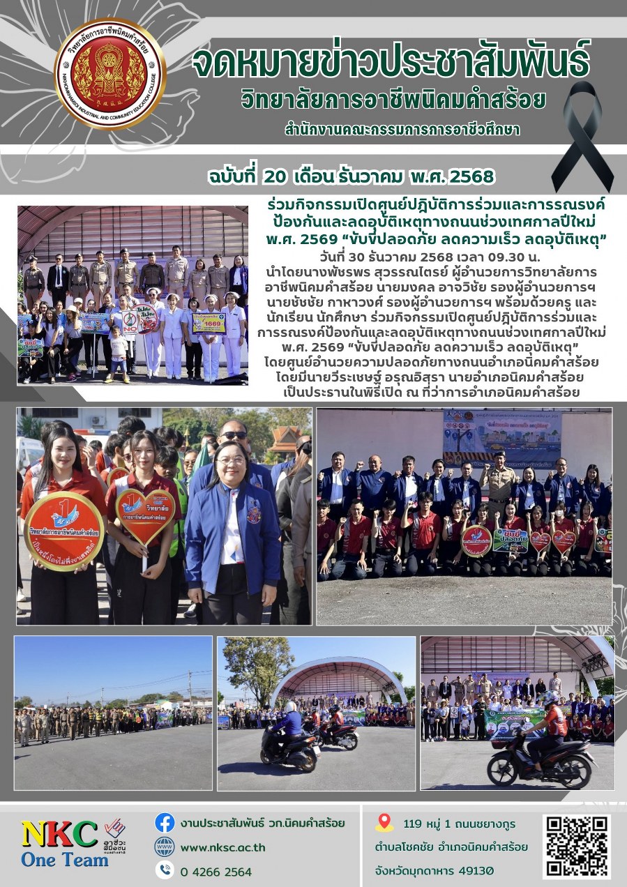 ฉบับที่ 20 ธ.ค. 2568 กิจกรรมเปิดศูนย์ปฎิบัติการร่วมและการรณรงค์ป้องกันและลดอุบัติเหตุทางถนน