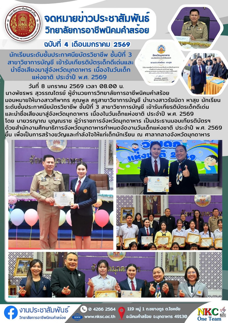 ฉบับที่ 4 ม.ค. 2569 รับเกียรติบัตรเด็กดีเด่นและนำชื่อเสียงมาสู่จังหวัดมุกดาหาร เนื่องในวันเด็กแห่งชา