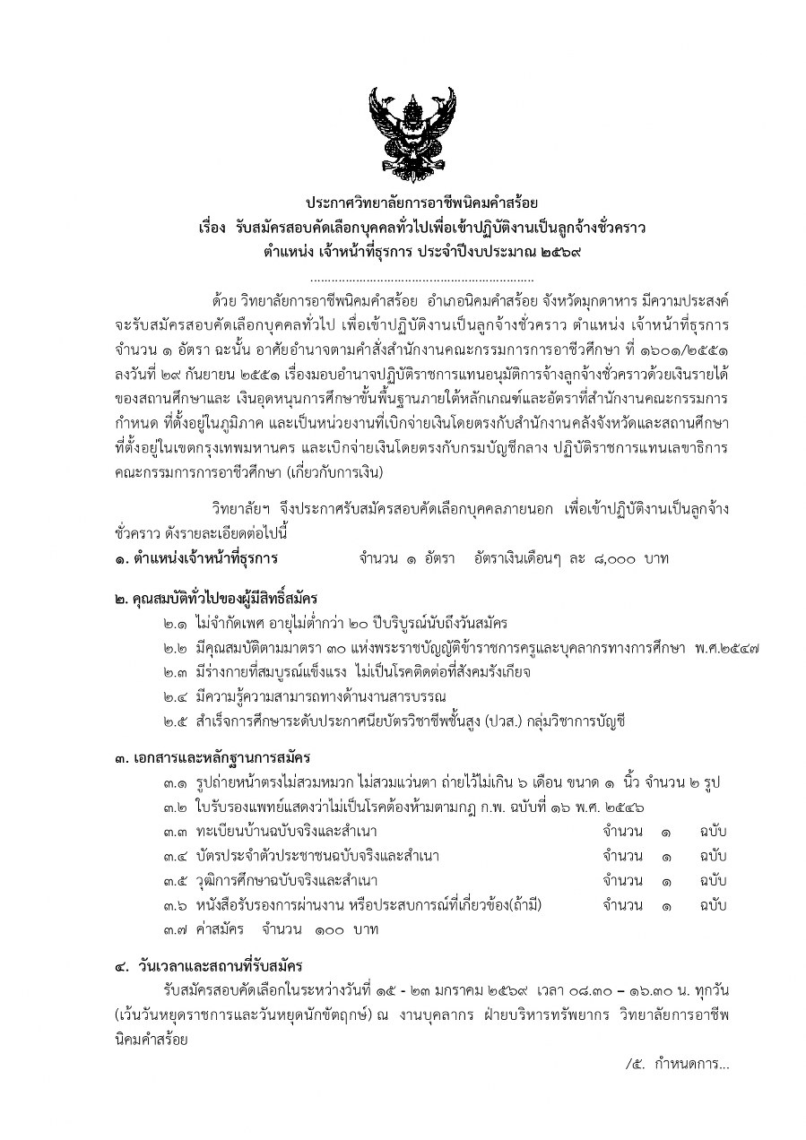 ประกาศวิทยาลัยการอาชีพนิคมคำสร้อย รับสมัครสอบคัดเลือกบุคคลทั่วไปเพื่อเข้าปฏิบัติงานเป็นลูกจ้างชั่วคราว ตำแหน่ง เจ้าหน้าที่ธุรการ ประจำปีงบประมาณ 2569 รับสมัครสอบคัดเลือกในระหว่างวันที่ 15 - 23 มกราคม 2569 เวลา 08.30 - 16.30 น. ทุกวัน(เว้นวันหยุดราชการและวันหยุดนักขัตฤกษ์) ณ งานบุคลากร ฝ่ายบริหารทรัพยากร วิทยาลัยการอาชีพนิคมคำสร้อย |