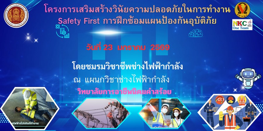 ประชาสัมพันธ์ เชิญชวนนักเรียน นักศึกษาทุกสาขาวิชา เข้าร่วมกิจกรรมโครงการเสริมสร้างวินัยความปลอดภัยในการทำงาน Safety First การฝึกซ้อมแผนป้องกันอุบัติภัย ในวันที่ 23 มกราคม 2569 เวลา 13.30 -16.30 น. โดยชมรมวิชาชีพช่างไฟฟ้ากำลัง ณ แผนกวิชาช่างไฟฟ้ากำลัง วิทยาลัยการอาชีพนิคมคำสร้อย |