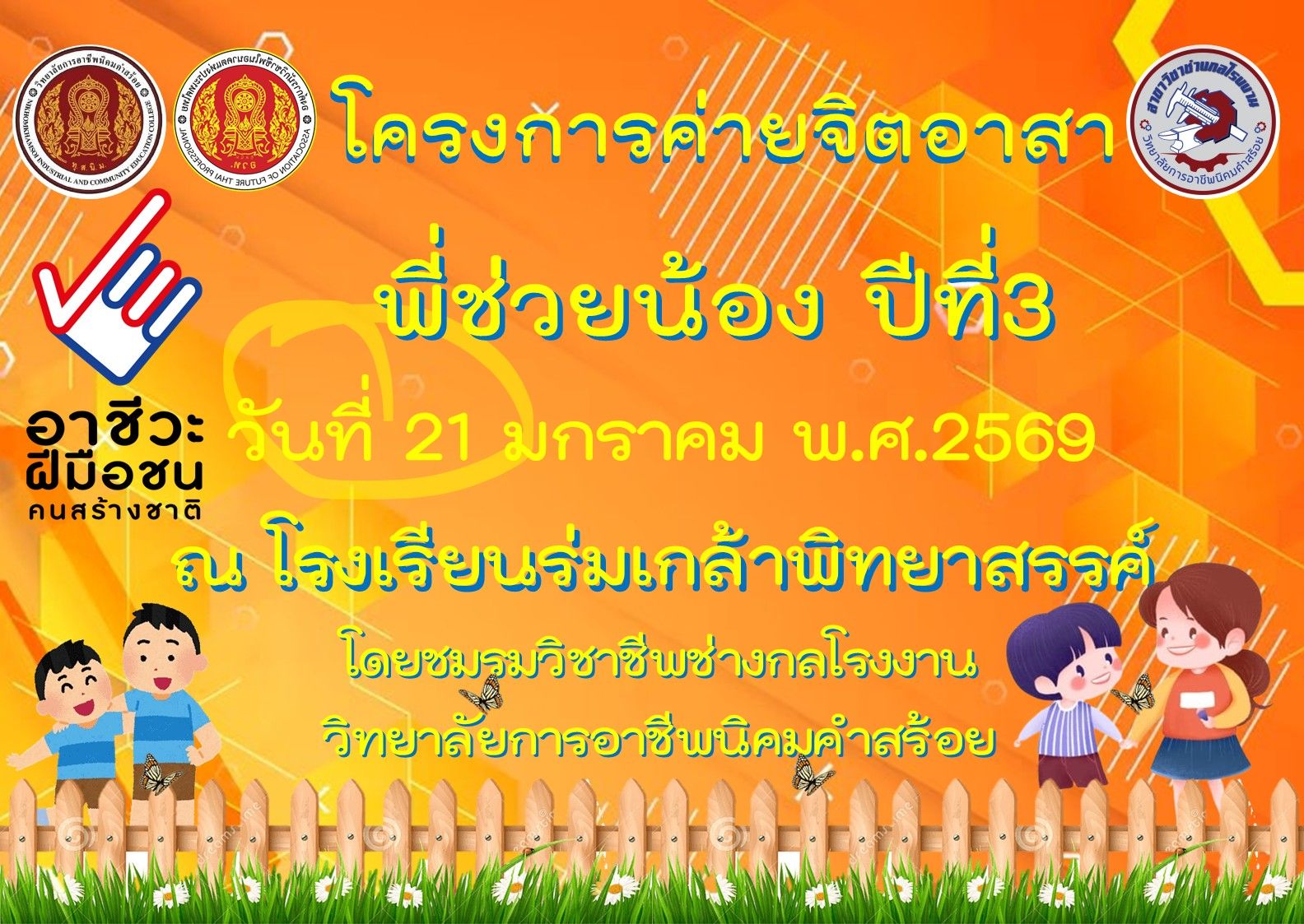 ขอเชิญชวนเข้าร่วมโครงการ “ค่ายจิตอาสาพี่ช่วยน้อง ปีที่ 3”   ขอเชิญชวนนักเรียน นักศึกษา และผู้สนใจ เข้าร่วมโครงการค่ายจิตอาสาพี่ช่วยน้อง ปีที่ 3 ซึ่งเป็นกิจกรรมที่มุ่งเน้นการปลูกฝังจิตสำนึกด้านจิตอาสา การเสียสละเพื่อส่วนรวม และการมีส่วนร่วมในการพัฒนาสังคม   ในวันอังคารที่ 21 มกราคม พ.ศ. 2569 ณ โรงเรียนริมเกล้าวิทยาสรรค์โดยความร่วมมือจากสาขาวิชาช่างกลโรงงาน วิทยาลัยการอาชีพนิคมคำสร้อย   |