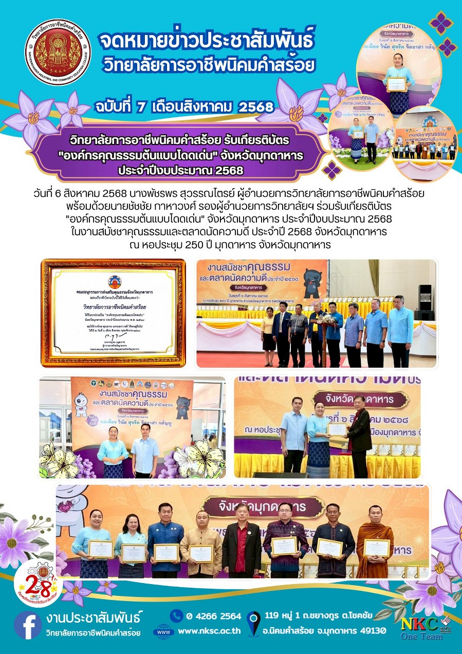 ฉบับที่ 7 ส.ค. 2568 รับเกียรติบัตร "องค์กรคุณธรรมต้นแบบโดดเด่น" จังหวัดมุกดาหาร