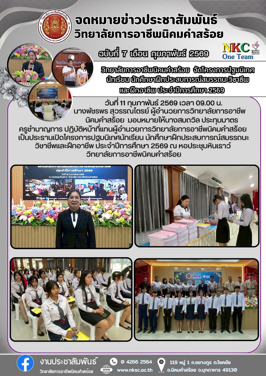 ฉบับที่ 7 ก.พ. 2569 โครงการปฐมนิเทศนักเรียน นักศึกษาฝึกประสบการณ์สมรรถนะวิชาชีพและฝึกอาชีพ