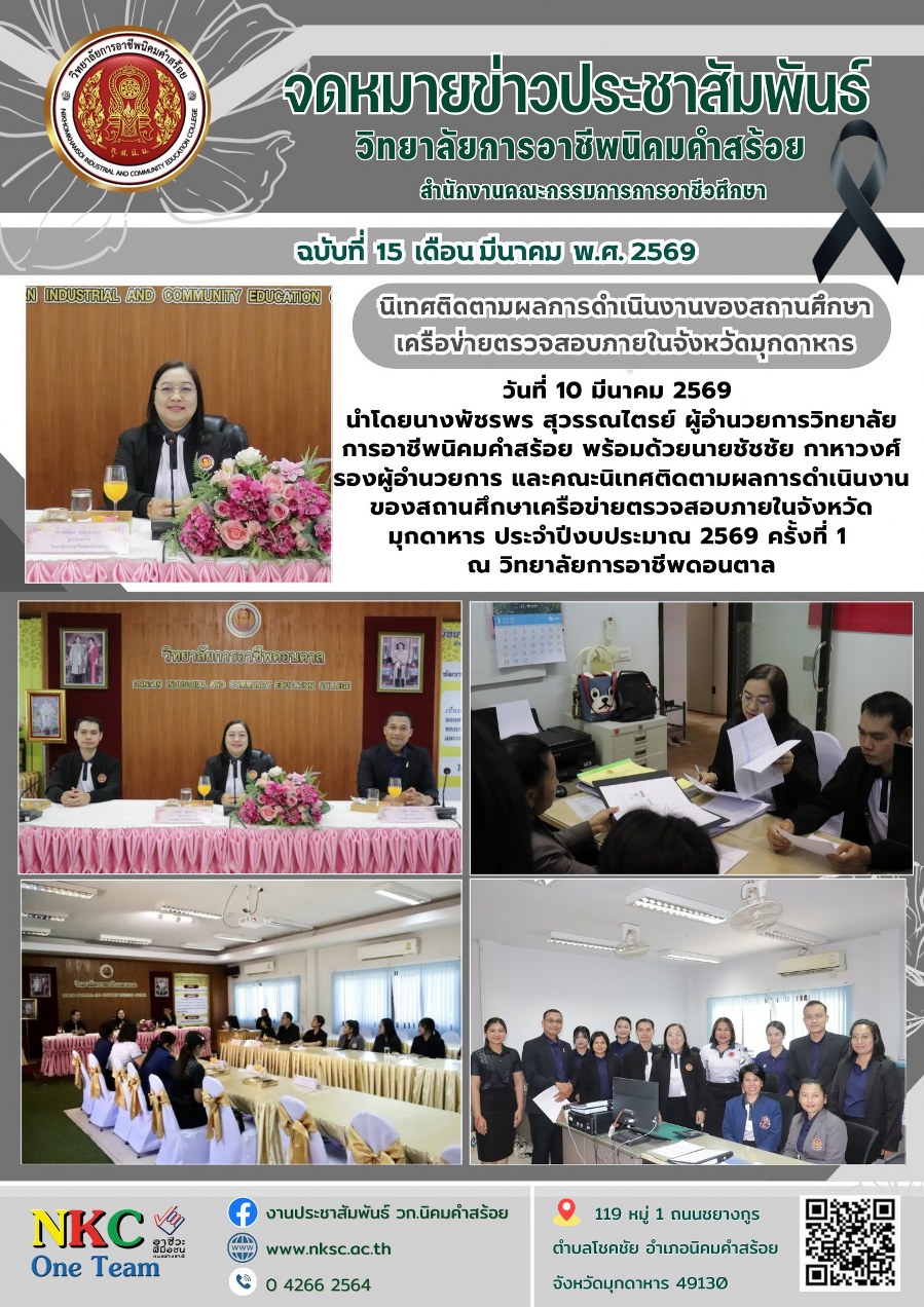 ฉบับที่ 15 มี.ค. 2569 นิเทศติดตามผลการดำเนินงานของสถานศึกษาเครือข่ายตรวจสอบภายในจังหวัดมุกดาหาร