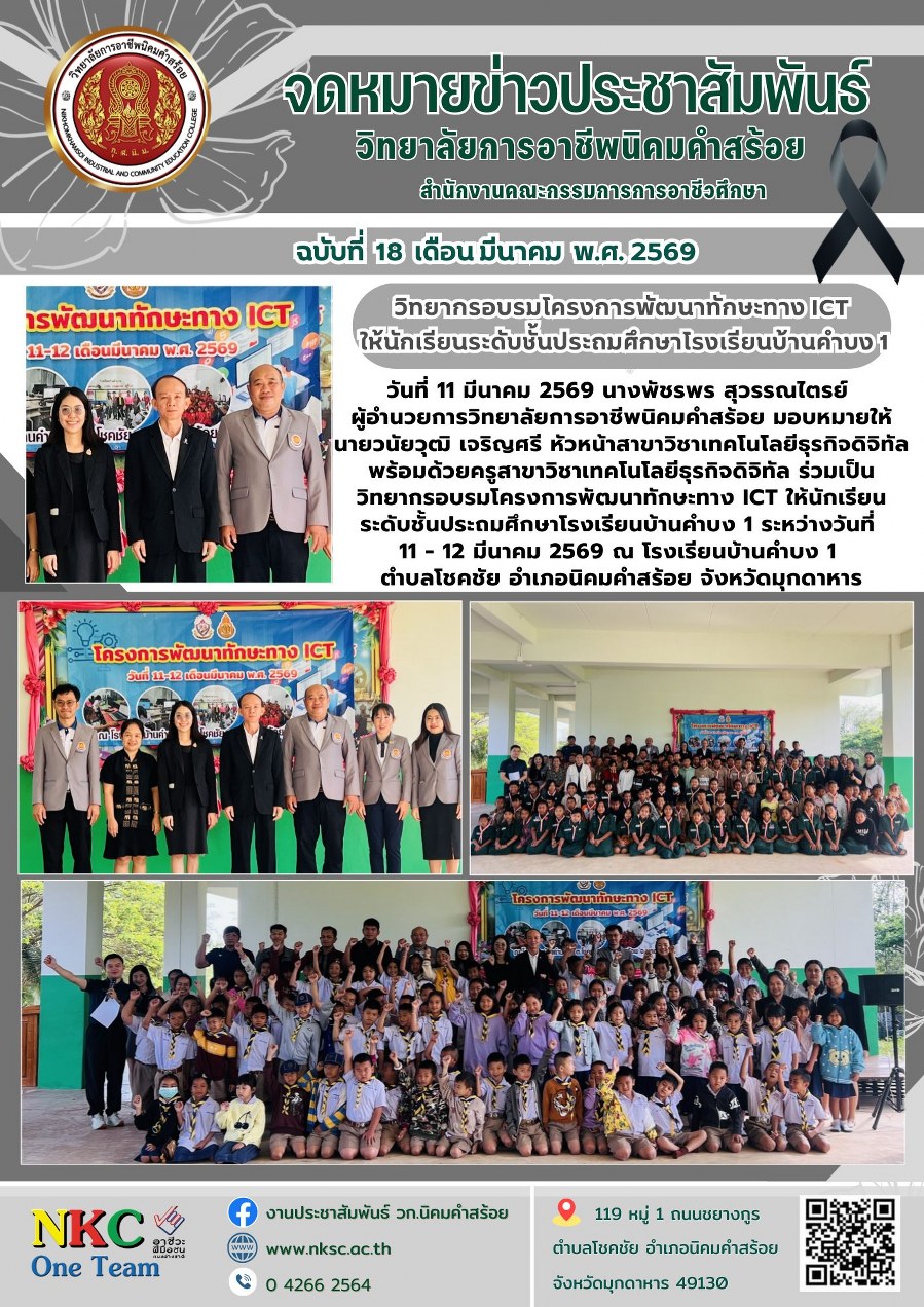 ฉบับที่ 18 มี.ค. 2569 วิทยากรอบรมโครงการพัฒนาทักษะทาง ICT ณ โรงเรียนบ้านคำบง 1